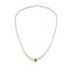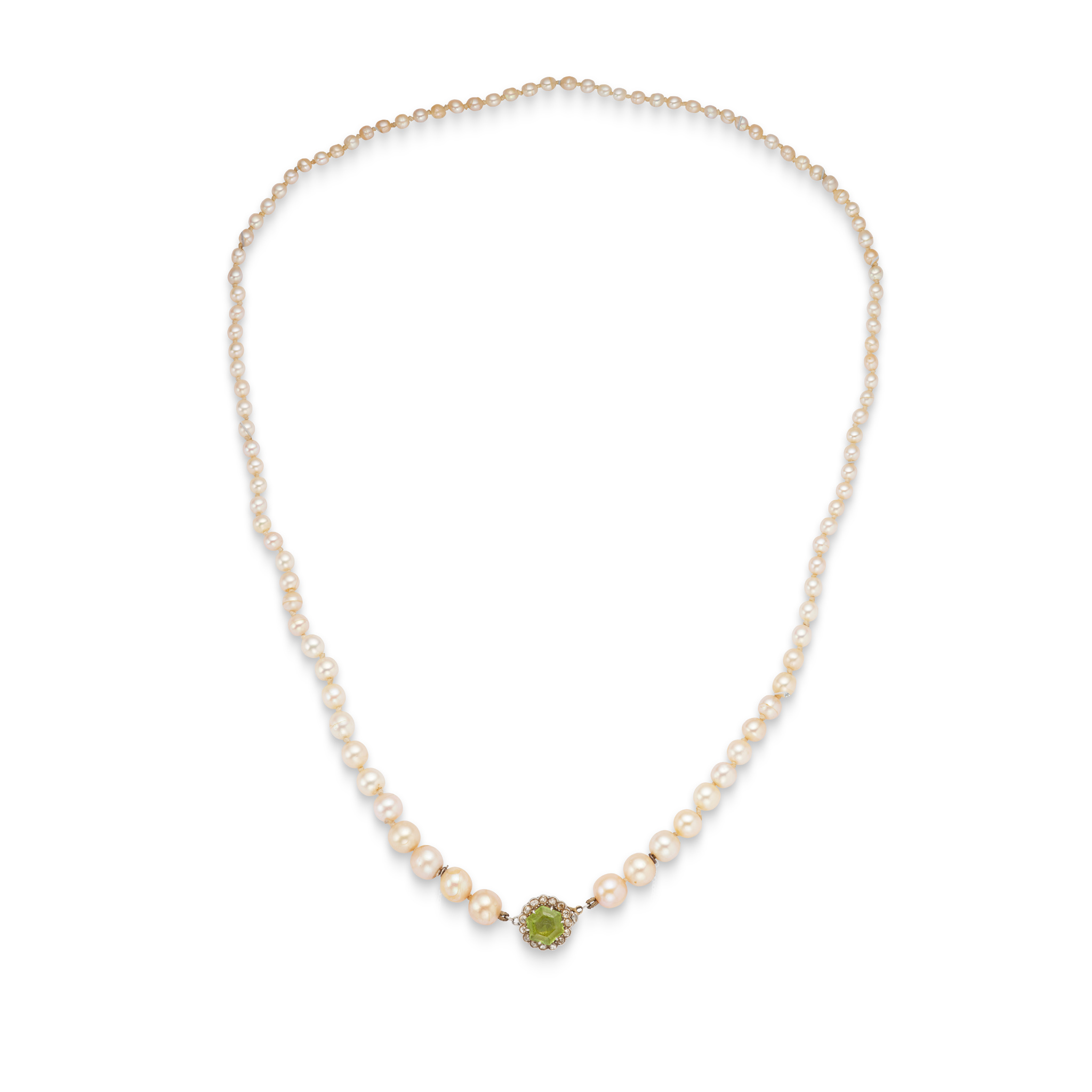Composed of a single-strand of graduated 3.1-7.8mm pearls, the clasp set with a hexagonal step-cut peridot, in a border of old brilliant-cut diamonds, length 55.0cm