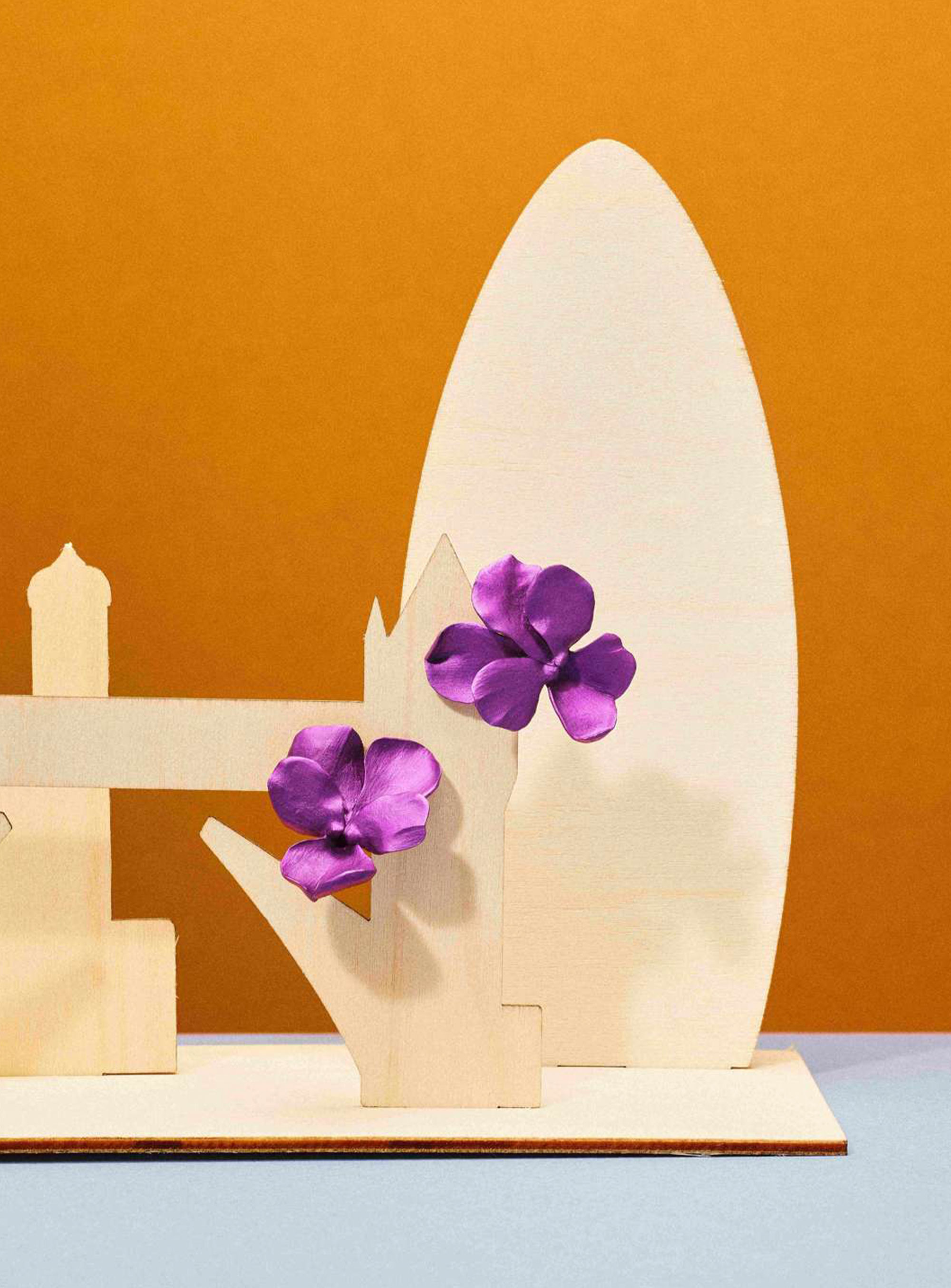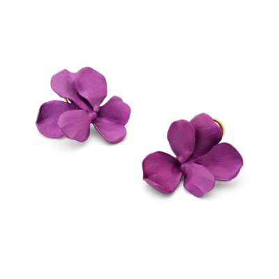 Each deep purple pansy of anodised aluminium, signed JAR, clip fittings, length 3.1cm, maker's pouch