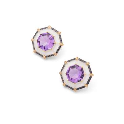 Each hexagonal-cut amethyst, within a frosted rock crystal surround, the frame set with circular-cut sapphires and brilliant-cut diamonds, mounted in 18 carat white gold, partial UK hallmarks, post fittings, length 2.2cm