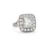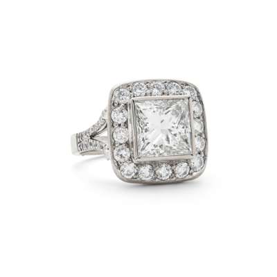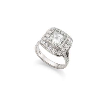 The princess-cut diamond, weighing 4.04 carats, in a collet-setting, within a brilliant-cut diamond surround, between bi-furcated shoulders set with similarly-cut diamonds, mounted in 18 carat white gold, remaining diamonds approx. 1.65 carats total, maker's mark DLM, London hallmark, ring size Q (shank off round)