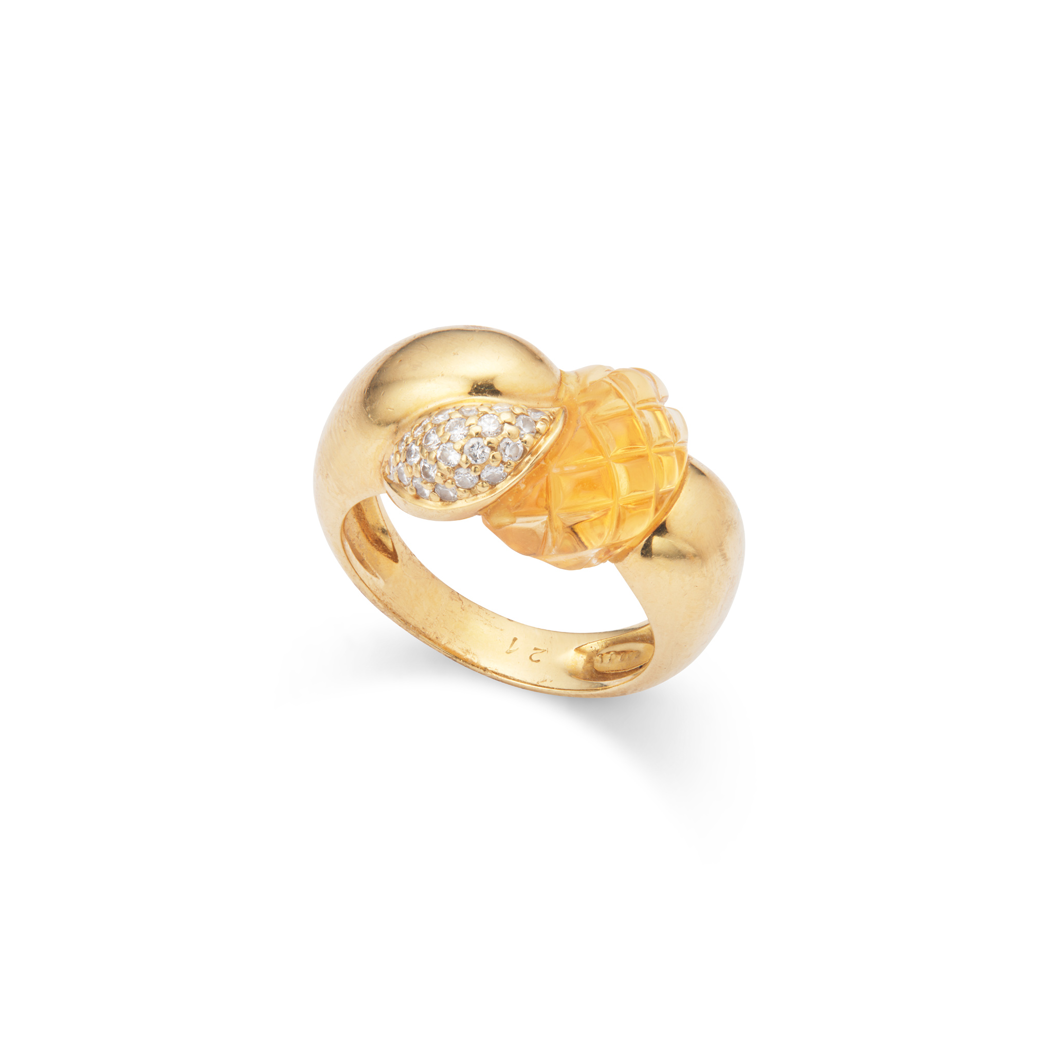 Centrally set with a carved citrine, between bulbous shoulders, one highlighted with pavé-set brilliant-cut diamonds, maker's mark AR for Rozier, French assay mark, ring size M