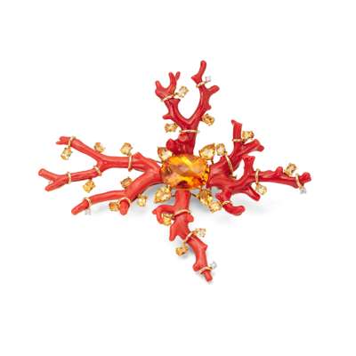 Centrally set with a large fancy-cut citrine, to radiating branches of coral, corallium rubrum, accented by pear-shaped and oval-cut citrines and brilliant-cut diamonds, diamonds approx. 0.30 carat total, length 13.4cm