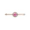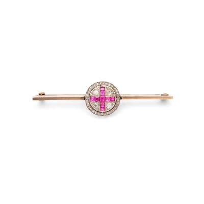 The polished bar brooch, centrally featuring a circular motif of the Flag of St George in calibrè-cut rubies and old brilliant-cut diamonds, within a rose-cut diamond frame, length 5.3cm, cased by Antrobus, 6-8 Old Bond Street, London W1