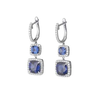 Each brilliant-cut diamond huggie surmount, suspending a pair of square step-cut and cushion-shaped sapphire and brilliant-cut diamond cluster drops, sapphires approx. 4.05 carats total, diamonds approx. 0.50 carat total, length 2.9cm