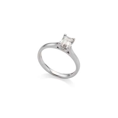The step-cut diamond, weighing 0.70 carat, in a four-claw setting to a platinum mount, maker's mark H.M, partial UK hallmark, ring size I