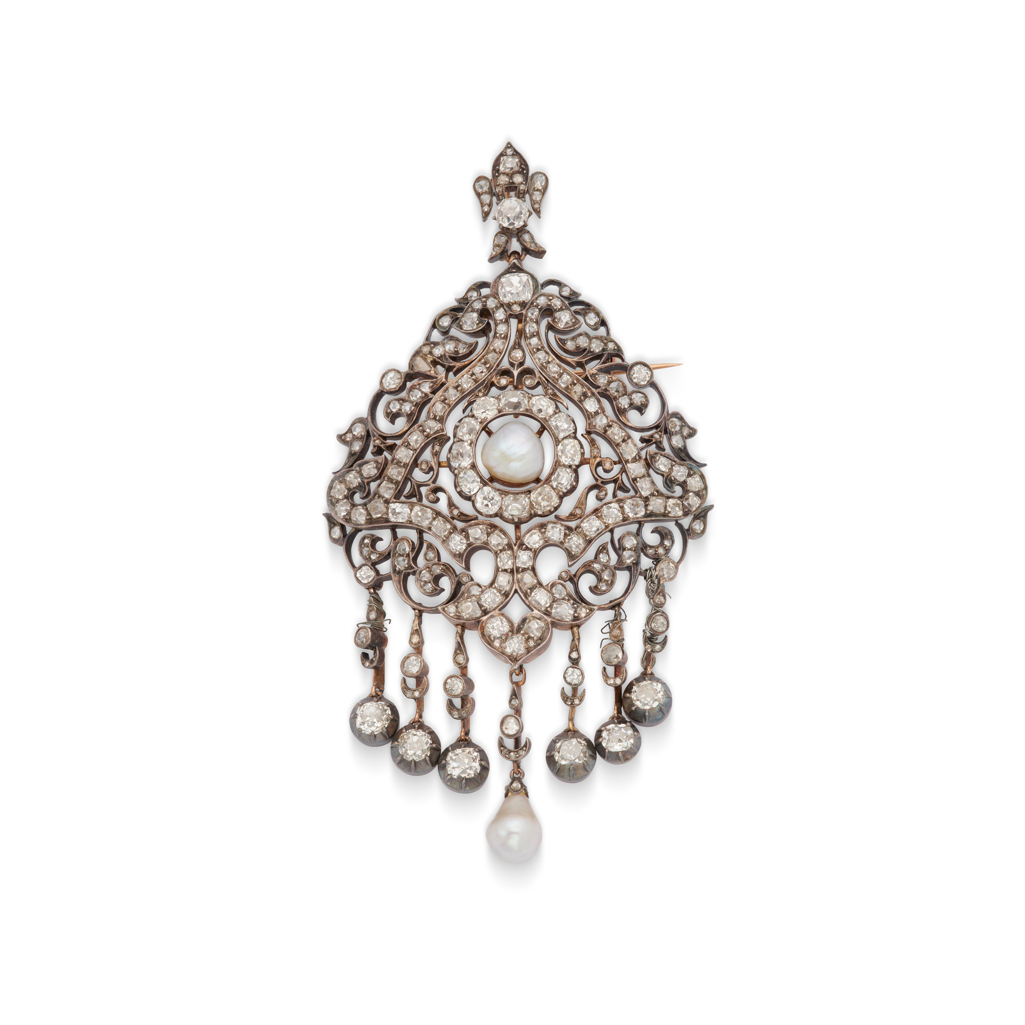 The detachable fleur-de-lys surmount set with rose, old brilliant-cut and cushion-shaped diamonds, to a pierced scrolling cartouche set throughout with rose, old brilliant-cut and cushion-shaped diamonds, centrally featuring an 8.1mm pearl, to a knife-wire diamond fringe with a central 7.4mm pearl drop, old brilliant-cut and cushion-shaped diamonds approx. 8.65 carats total, detachable pendant and brooch fittings, length 10.1cm