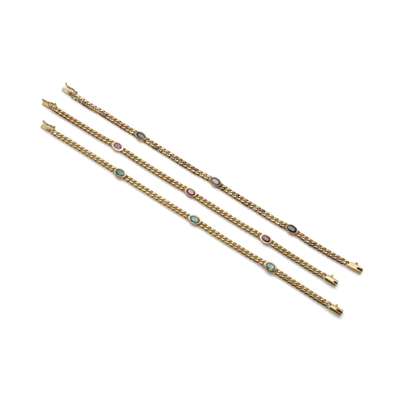 Each curb-link chain, collet-set at intervals with oval-cut rubies, sapphires and emeralds, transformable into a necklace, lengths 19.0, 19.2 and 19.3cm (3)