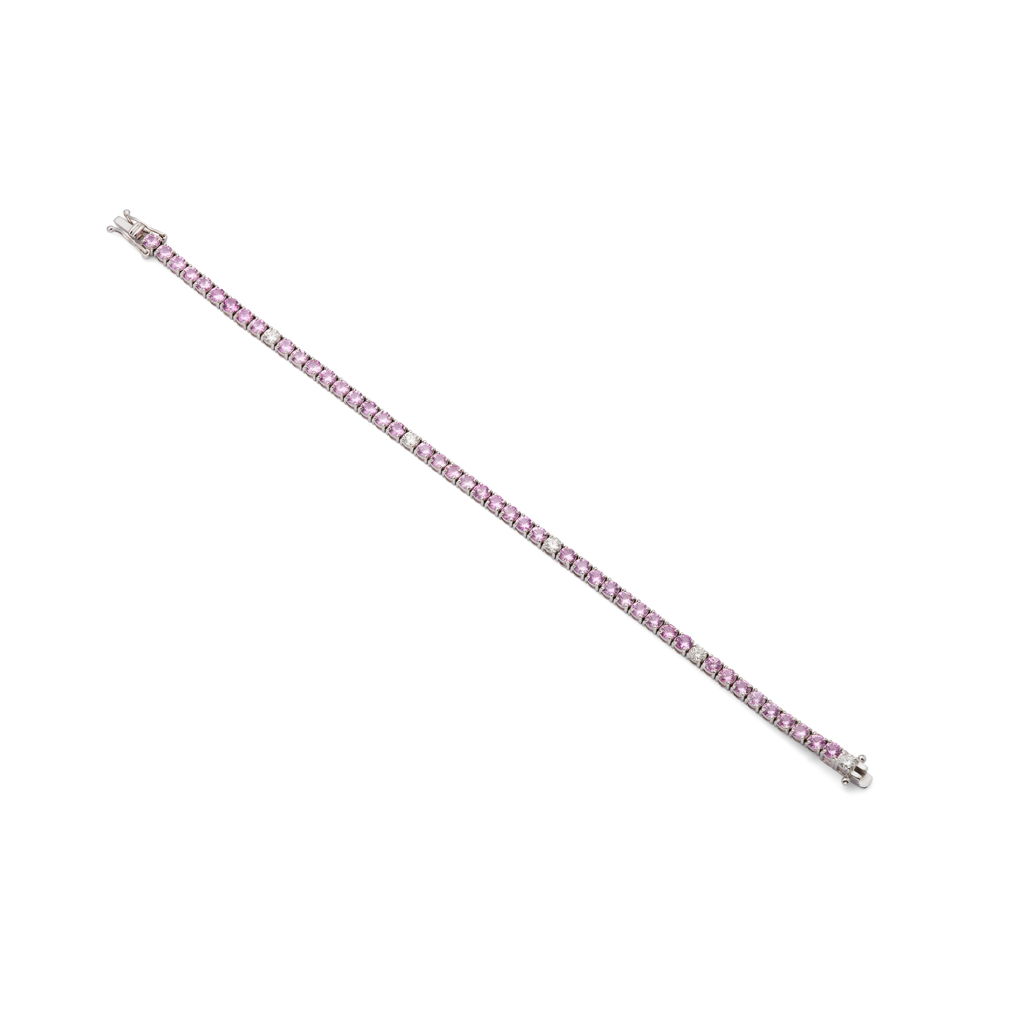 The tennis bracelet set with a continuous line of circular-cut pink sapphires, accented at intervals with brilliant-cut diamonds, diamonds approx. 0.60 carat total, pink sapphires approx. 5.85 carats total, length 18.2cm
