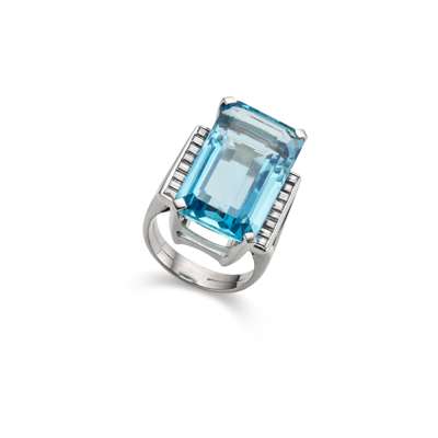 The step-cut aquamarine, in a four-claw setting, between courses of baguette-cut diamonds, diamonds approx. 0.45 carat total, aquamarine approx. 15.00 carats, ring size M