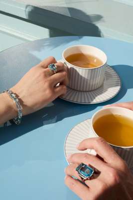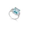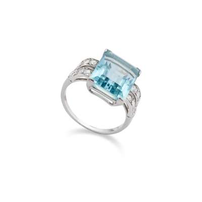 The step-cut aquamarine, in a four-claw setting, between bi-furcated shoulders set with brilliant and old brilliant-cut diamonds, diamonds approx. 1.00 carats total, aquamarine approx. 7.25 carats, ring size N½