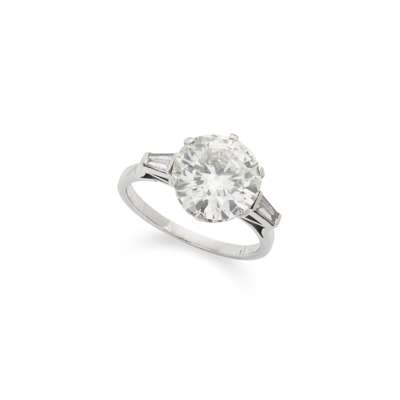 The old brilliant-cut diamond, weighing 5.01 carats, in a six-claw setting, between baguette-cut diamond shoulders, ring size R