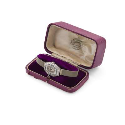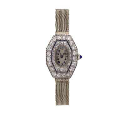 The oval dial featuring blue enamel Arabic numerals, within an octagonal surround set with calibré-cut synthetic sapphires and old brilliant, brilliant and single-cut diamonds, with a synthetic sapphire crown, to a mesh strap, diamonds approx. 3.15 carats total, mechanical movement signed Redpearl Geneve Swiss, strap with maker's mark GF, Swiss assay mark, cased by W.A. Perry & Co., 4 Snow Hill, Birmingham