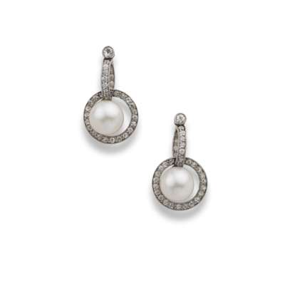 Each 8.2-8.7mm cultured pearl, within a single and old brilliant-cut hoop surround and surmount, millegrain detail throughout, diamonds approx. 0.60 carat total, post fittings, length 2.4cm, cased by Mappin & Webb Ltd., Queen Victoria Street, London E.C.4