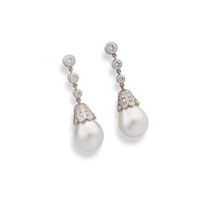 Each 13.3-13.6mm cultured pearl, capped by brilliant-cut diamonds and suspended from a graduated trio of collet-set similarly-cut diamonds, diamonds approx. 3.25 carats total, post fittings, length 4.5cm