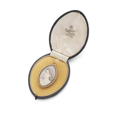 Of navette form, the miniature depicting a young woman in profile looking left, wearing a white blouse and jewellery, within a seed pearl frame, glazed compartment containing hairwork to the reverse, miniature signed Sydy. Slade 1904, pendant length 5.7cm, miniature 4.7x3.0cm, cased