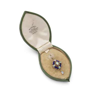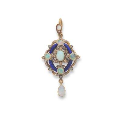 An opal, enamel and diamond pendant, circa 1870