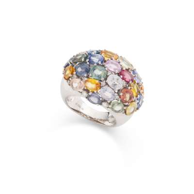Set throughout with oval-cut gems including multi-coloured sapphires, pink tourmaline and brilliant-cut diamond accents, mounted in 18 carat white gold, London hallmark, ring size M