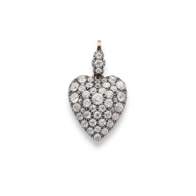 The bulbous heart, set throughout with old brilliant-cut diamonds, to a detachable bale, glazed compartment to the reverse, diamonds approx. 4.25 carats total, length 3.6cm