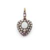 The oval cabochon opal within a rose cut diamond surround, glazed compartment to the reverse, length 3.2cm, cased
