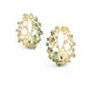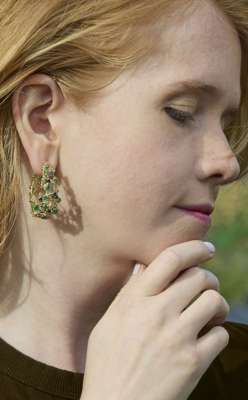 Each 18 carat gold openwork hoop, adorned with “caviar” granulation, circular-cut emeralds and sapphires and brilliant-cut diamonds, diamonds approx. 1.25 carats total, maker's mark CdeT, London hallmark, post fittings, length 4.0cm