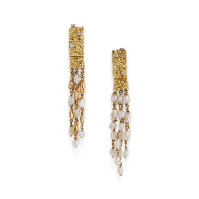 Each contoured surmount, adorned with “caviar” detail throughout, accented by brilliant-cut diamonds, suspending two sets of freshwater pearl and polished nugget tassels, unsigned, length 7.0cm