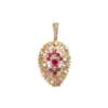 The pear-shaped drop of pierced textured 18 carat white and yellow gold form, set with a central oval-cut ruby, surrounded by circular-cut rubies and brilliant-cut diamonds, to a hinged bale, diamonds approx. 1.00 carat total, maker's mark CdeT, London hallmark, length 5.1cm, maker's pouch