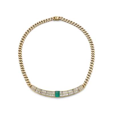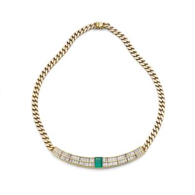 The step-cut emerald, between graduated courses of baguette-cut diamonds, to a flattened curb-link chain, emerald approx. 1.30 carats, diamonds approx. 4.25 carats total, length 37.4cm