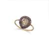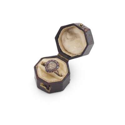 The pear-shaped plaque, with a central glazed compartment containing hairwork, within a table-cut garnet surround, to a twisted shank, ring size K½, cased