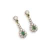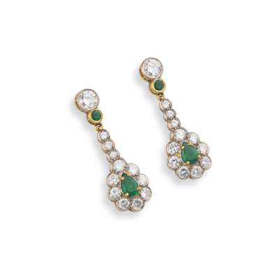 Each pear-shaped emerald, within a brilliant-cut diamond surround, suspended from a line of similarly-cut diamonds and a circular-cut emerald accent, mounted in 18 carat gold, diamonds approx. 1.90 carats total, illegible maker's mark, London hallmark, post fittings, length 2.3cm