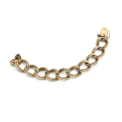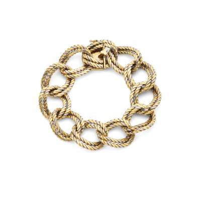 The articulated line of double flattened ropetwist bi-coloured links, to a concealed clasp, unidentified assay marks, length 20.1cm