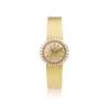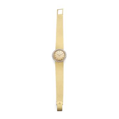 The brushed dial, with baton hour markers, within a brilliant-cut diamond bezel, to an integral bracelet, diamonds approx. 0.30 carat total, dial, case and mechanical movement signed Omega, Swiss assay mark, case width 24.1mm, bracelet length 16.8cm