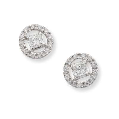 Each princess-cut diamond, within a brilliant-cut diamond halo surround, diamonds approx. 0.90 carat total, post fittings, length 1.1cm