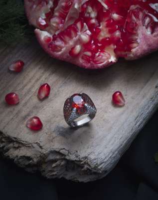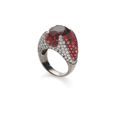 The oval-cut spessartine garnet, within a raised contoured setting, pavé-set with circular-cut orange garnets and brilliant-cut diamonds, principal garnet approx. 8.50 carats, diamonds approx. 2.60 carats total, signed Kutchinsky, ring size N