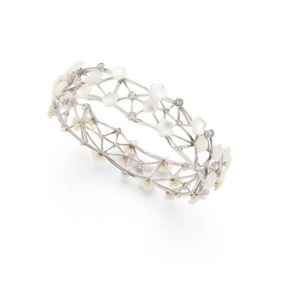 The hinged openwork 18 carat white gold bangle adorned with carved mother-of-pearl flowerheads and brilliant-cut diamonds, diamonds approx. 1.75 carats total, maker's mark FL, UK hallmark, inner diameter 6.2cm