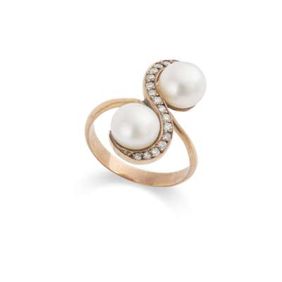 The stylised S motif set with single-cut diamonds and 8.3-8.5mm pearls, pearls untested, ring size R