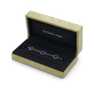The five blue agate motifs, each in a perlée surround, connected by a filed trace-link chain, signed VCA, maker's mark, numbered, French assay mark, length 19.3cm, maker's case and box