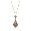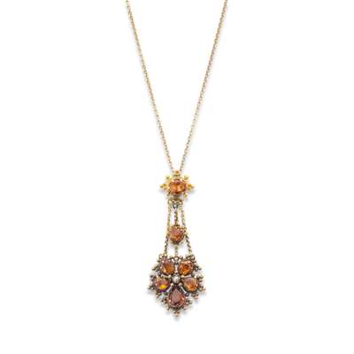 With granulation detail throughout, the oval-cut topaz horizontally-set surmount, suspending a pear-shaped topaz cluster flowerhead, centrally highlighted by a seed pearl, to a later trace-link chain, lengths: pendant 4.6cm, chain 48.3cm, cased by E.H Lewis, 83 East St Chichester