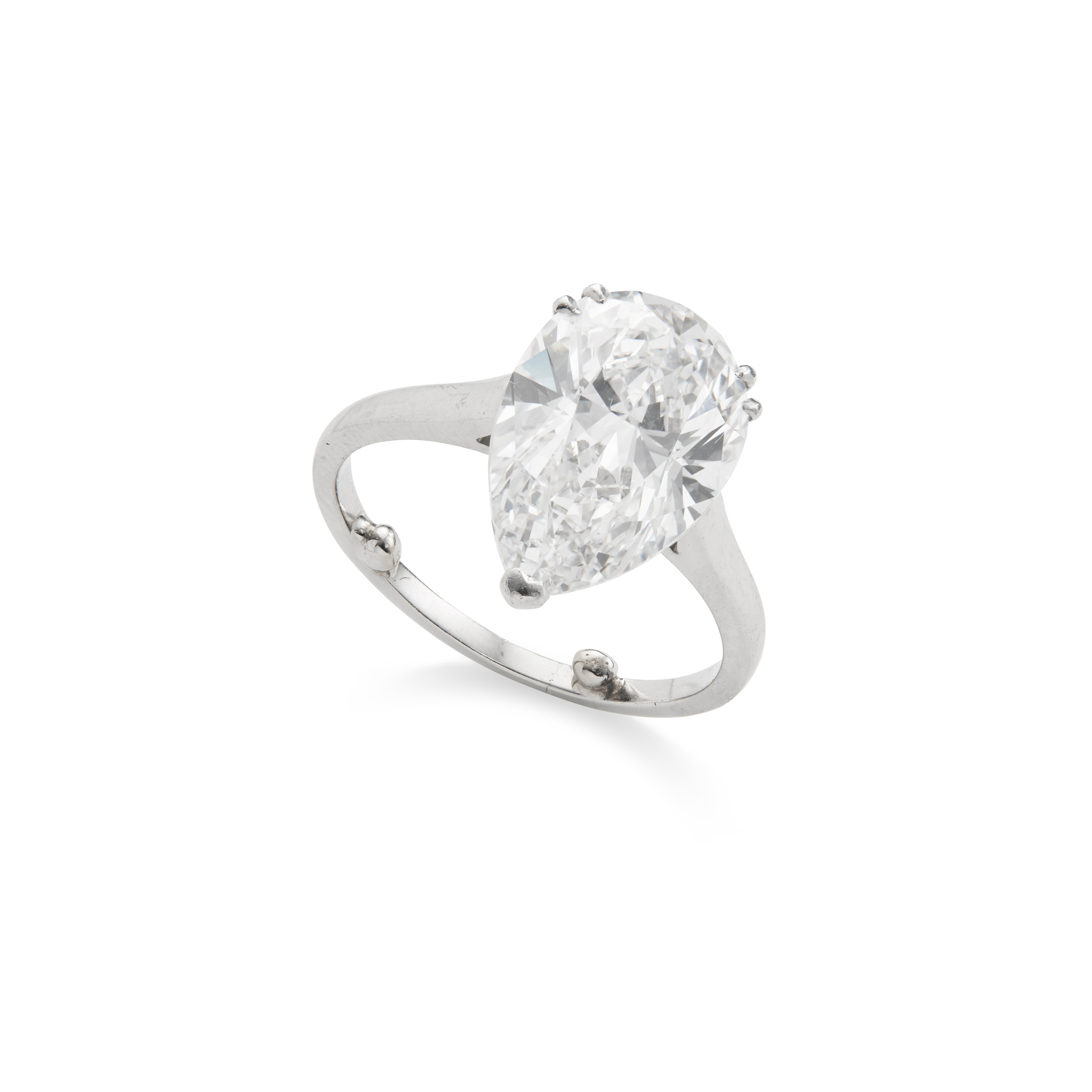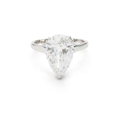 The pear-shaped diamond, weighing 4.92 carats, in a double three-claw setting, ring size approx. M½ (sizing beads)