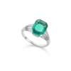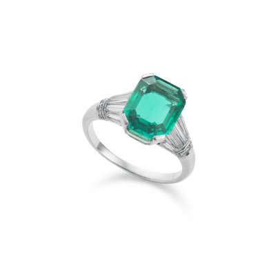 The step-cut emerald, in a four-claw setting, between curved single and baguette-cut diamond shoulders, diamonds approx. 0.60 carat total, ring size N½