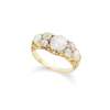 Set with three half pearls, of silver tint, spaced by pairs of cushion-shaped diamonds, to an engraved gallery, ring size K½