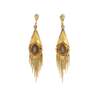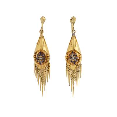 Each flattened pear-shaped drop decorated with a blue enamel star motif, a central seed pearl, ropetwist and beaded detail, suspending an articulated fringe, later gold plated screwback fittings, length 6.3cm