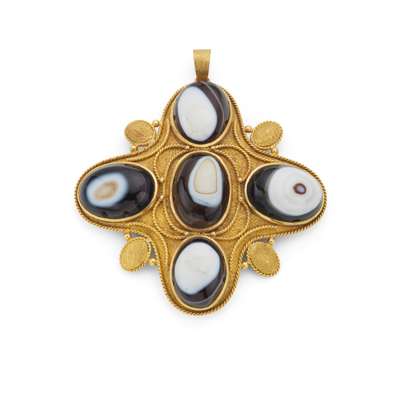 Set with five oval cabochon agates, decorated with ropetwist details throughout, length 11.1cm