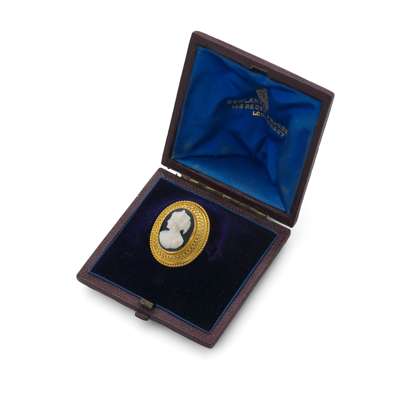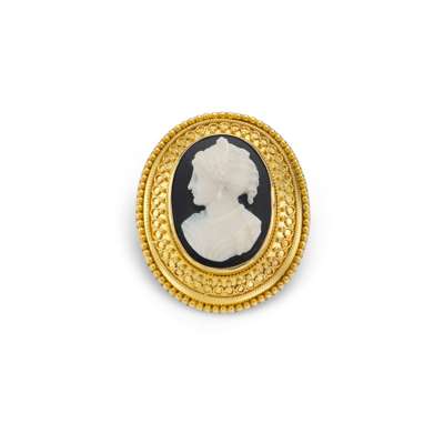 The hardstone onyx cameo of a woman in profile, looking left, in Renaissance attire, within a delicate granulation and wirework frame, cameo 1.9x1.4cm, brooch length 3.0cm, fitted case by Rowlands & Frazer, 146 Regent Street, London