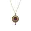 The circular pendant decorated with lobes of lavender enamel, within ropetwist frames, centrally collet-set with a circular cabochon amethyst, suspending an oval-cut amethyst drop, to a later fancy-link chain, lengths: pendant 3.5cm, chain 46.0cm