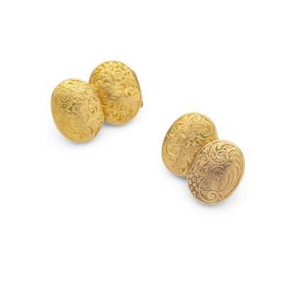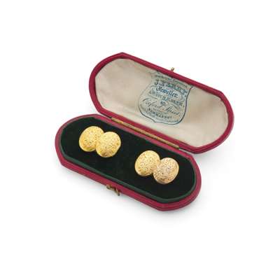 Each finely chased oval terminal, containing a locket, between oval connectors, terminal length 1.5cm, cased by J. Perry, 40 Oxford Street