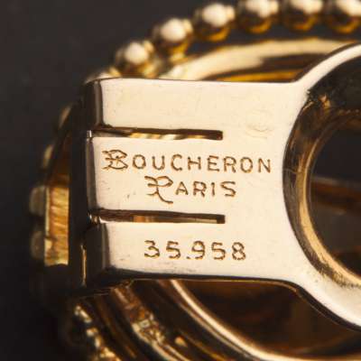 Each contoured curved leaf, within a pierced triple frame, signed Boucheron Paris, numbered, French export marks, clip fittings, length 2.5cm
