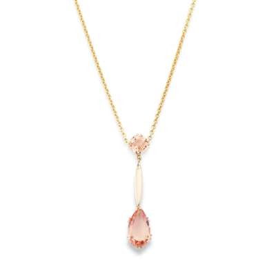 The pear-shaped topaz drop, to a polished spacer, surmounted by a circular-cut topaz, suspended from a belcher-link chain, lengths: pendant 3.8cm, chain 43.1cm, cased by W. Michael & J.H. Bailey, Dolphins Street, Bristol