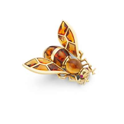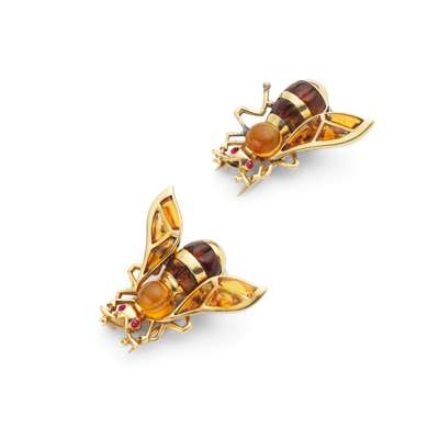 Each stylised bumblebee set with a circular cabochon citrine thorax, with calibré-cut citrines to the abdomen and wings, and circular cabochon ruby eyes, one wing deficient, lengths 4.1cm, 2.6cm and 2.7cm (3)