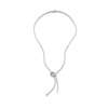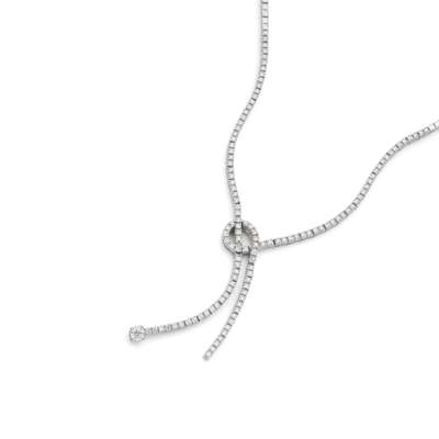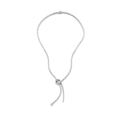 The courses of brilliant-cut diamonds, with a central stylised knot, suspending two uneven drops, one terminal set with a larger similarly-cut diamond, to a polished brick-link backchain, diamonds approx. 5.15 carats total, length 43.1cm