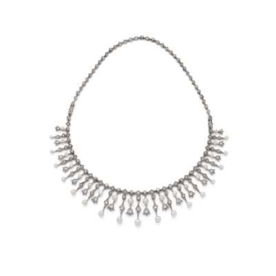 The graduated line of knife-wire bars, each set with a 2.7mm- 4.8mm bouton pearl, rose and old brilliant-cut diamonds, terminating in a tulip gallery set with a rose-cut diamond, the lower line of circular and navette-shaped links, each set with a rose-cut diamond, convertible into the back chain, old brilliant-cut diamonds approx. 0.75 carat total, pearls untested, tiara inner diameter 13.5cm, necklace length 37.5cm, fitted necklace case by Collingwood